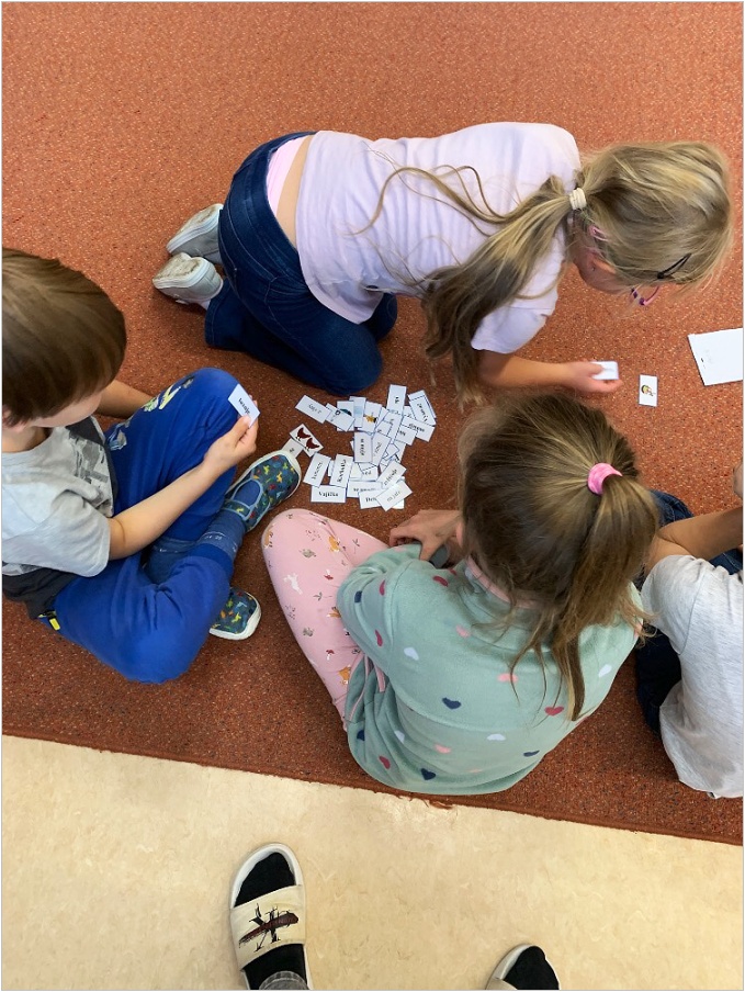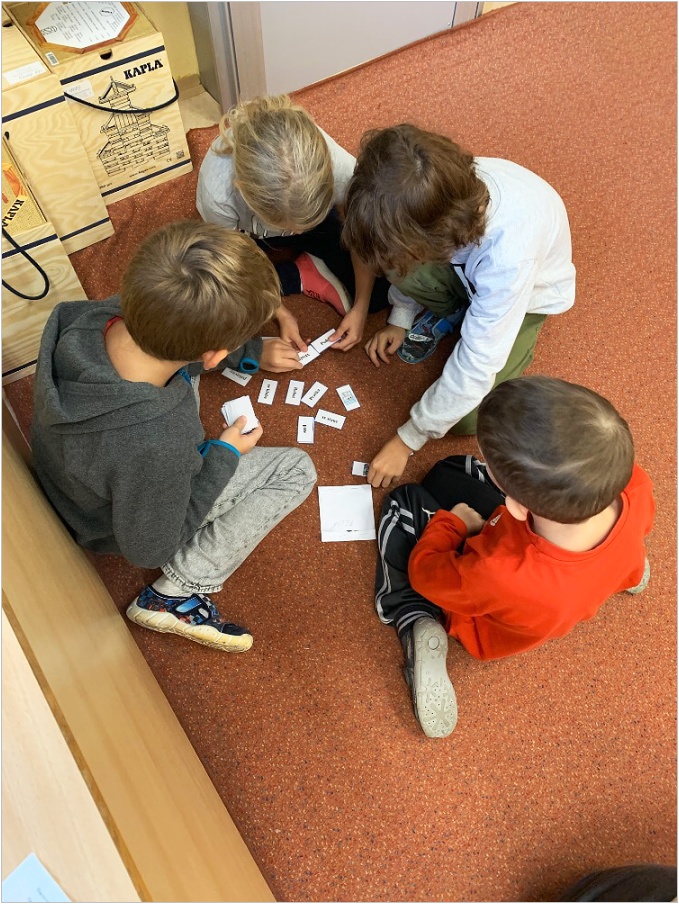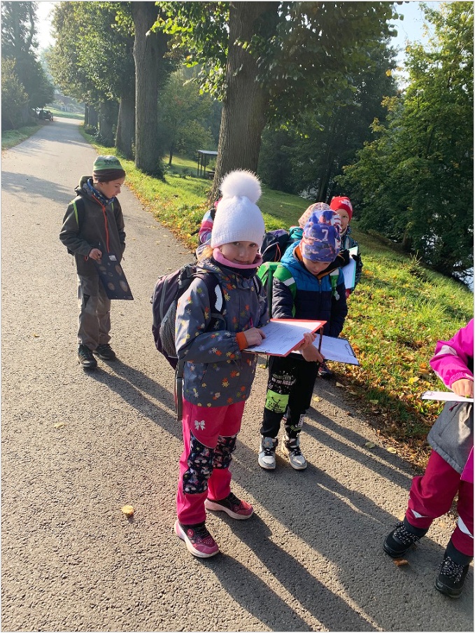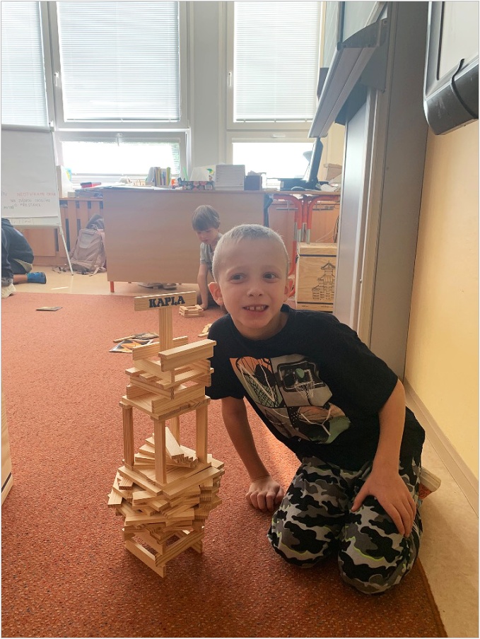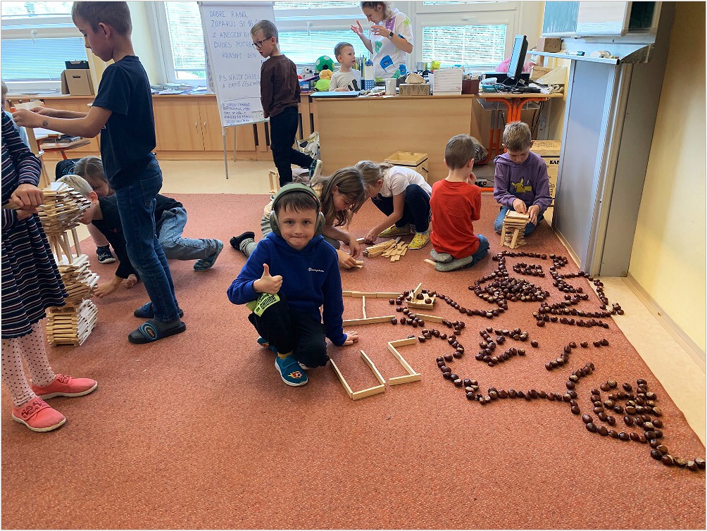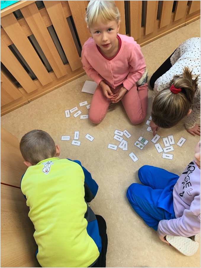 V září nás provázela pohádka ČERVENÁ KARKULKA a v říjnu nás provázel Smolíček. Nejvíce nás bavilo stavět ze stavebnice KAPLA, byli jsme na výuce venku, pracovali ve skupinkách, tvořili jsme obrázek z ČERVENÉ KARKULKY a jelena nebo Jezinku z kaštanu a dalších přírodnin.